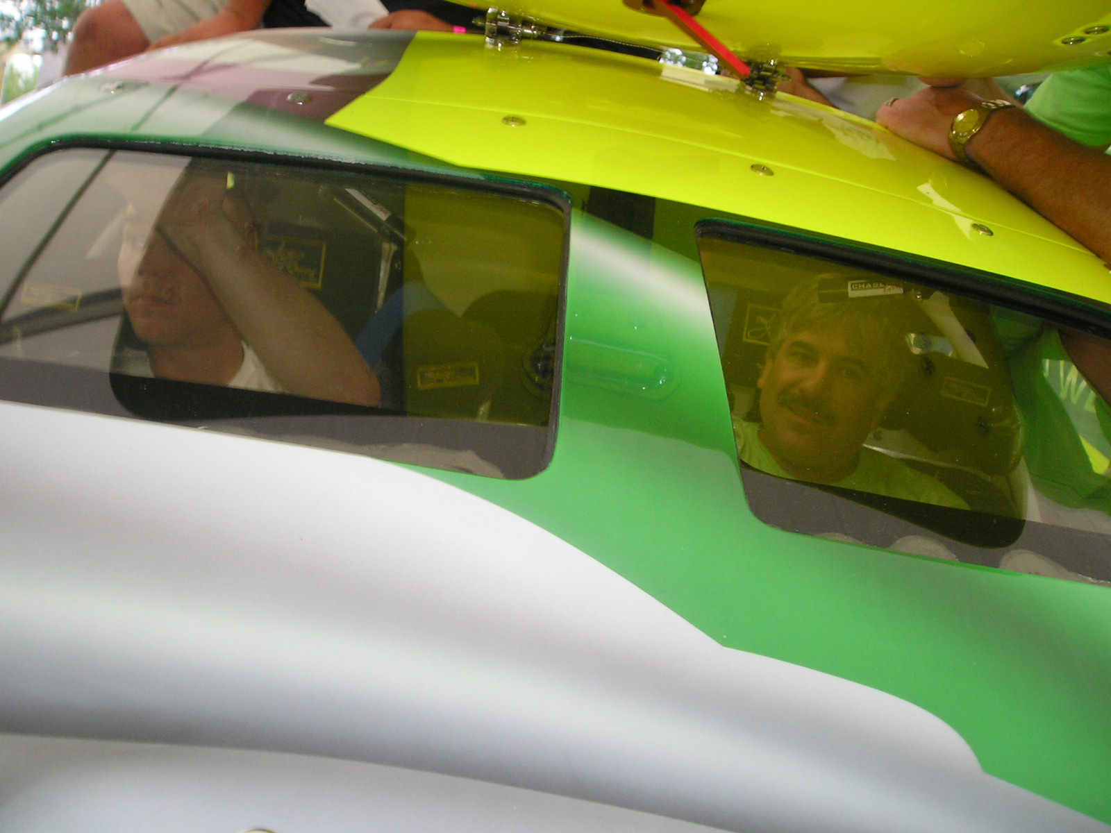 Two fans sit in Miss Geico
