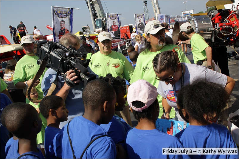 Driver-in-training Bianca Bononcini signs autographs while kids say HI to the camera.